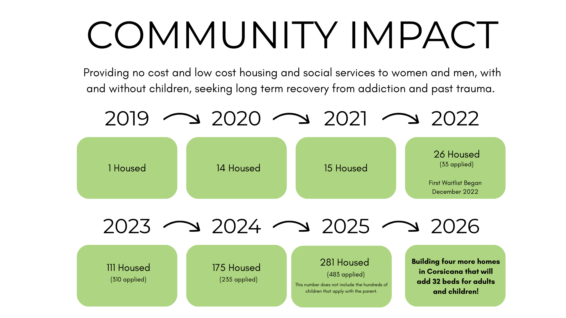 Studies show that up to 70% of individuals relapse within the first 90 days after leaving treatment or incarceration when stable housing and structured support are not in place. In Texas, hundreds of people are booked every day on drug-related charges, yet many no-cost recovery housing options are located far from employment opportunities, probation requirements, recovery meetings, and basic daily needs. Without accessible, long-term support, individuals are set up to fail—creating a costly cycle that impacts families, communities, and taxpayers.